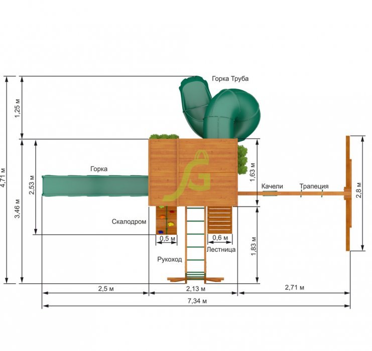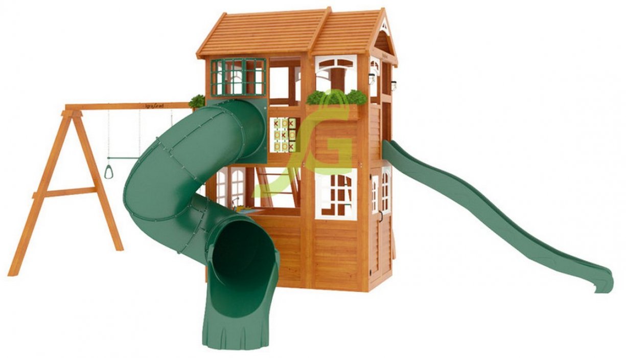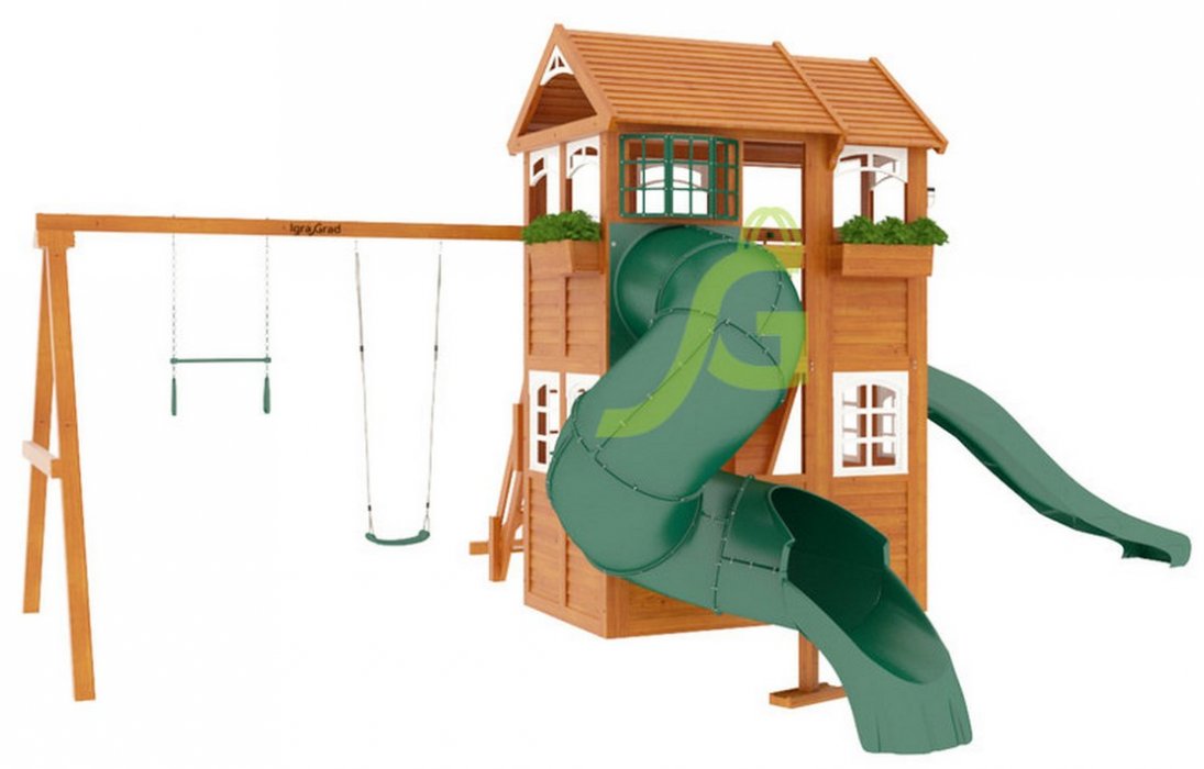 Детская площадка для дачи включает в себя целый игровой комплекс, в который входит: закрытый двухуровневый домик (с деревянной крышей и дверью), рукоход, скалодром, два вида горок (волновая и горка-труба), доска для игры в “Крестики-нолики”, разнообразные качели, канат и многие другие комплектующие элементы. Маленькие альпинисты оценят надежность скалодрома и страховочных канатов. Комплекс достаточно прочный, безопасный и экологичный. В нем вы не найдете острых углов, а крепления настолько надежные, что можете не волноваться о безопасности своего ребенка во время игры.