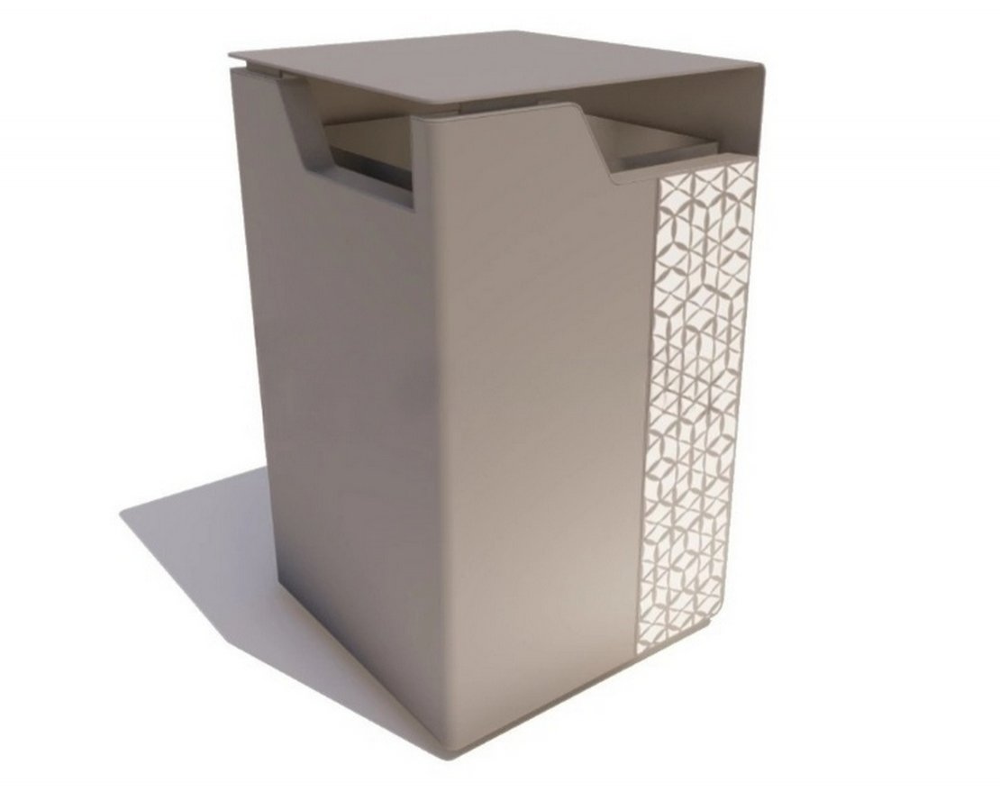 Уличная урна «Концепт» выполнена в стиле хай-тек. Внешняя сторона покрашена полимерной краской. Цвет покрытия можно изменить. Центральным элементом декора является геометрический узор, выполненный флуоресцентным порошком. В темноте он светится, обозначая место для утилизации отходов.